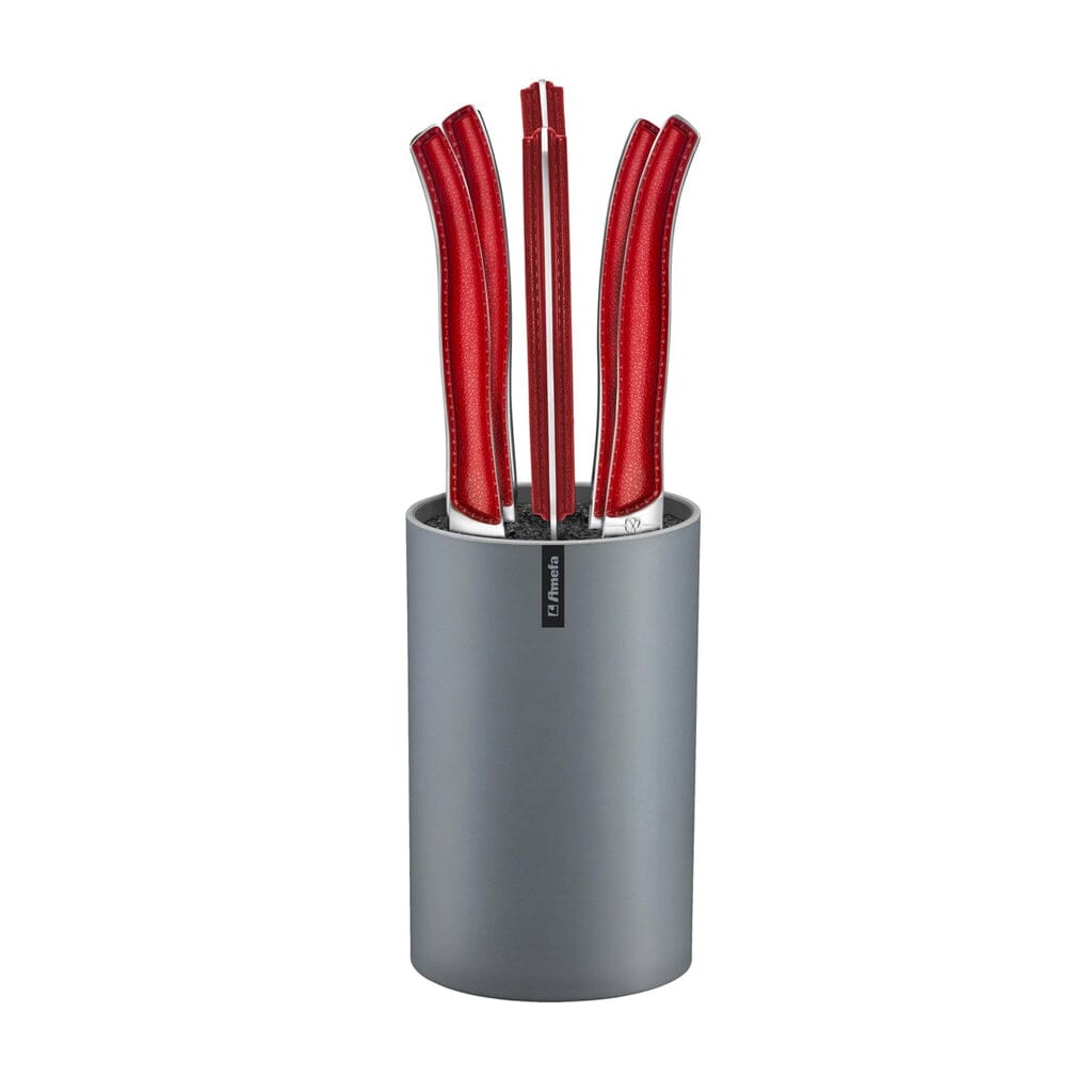 Les couteaux sont livrés avec un bloc à couteaux élégant de couleur grise. Ce bloc à couteaux universel possède un intérieur flexible constitué de tiges en plastique. Cela signifie que vous n'avez pas besoin de placer les couteaux en vrac dans le tiroir de la cuisine, ce qui réduit le risque de dommages.