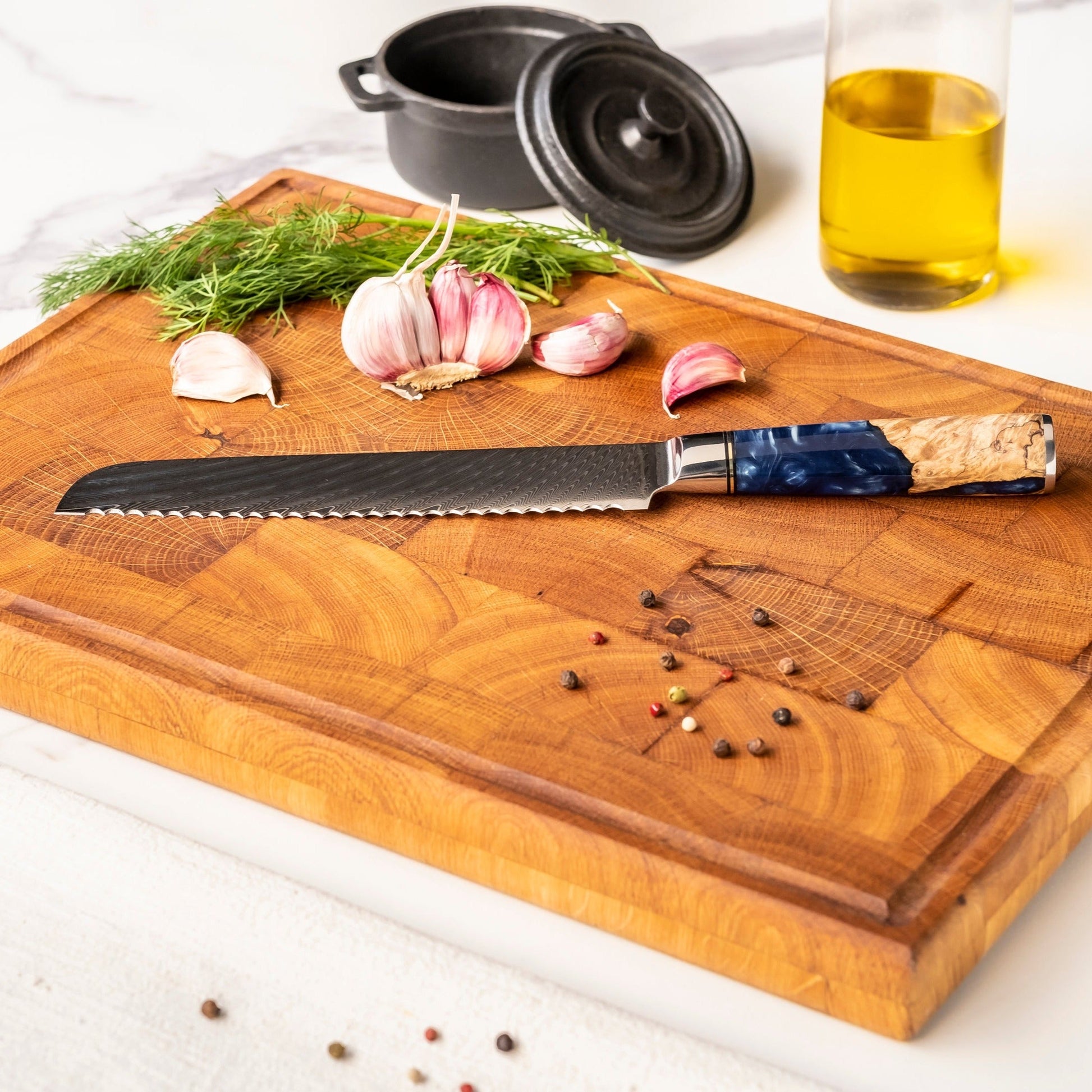 Ce bloc à couteaux en bois d'acacia est livré avec 6 couteaux de la série Epoxy Sapphire qui conviennent à diverses tâches de coupe en cuisine. La combinaison de poignées époxy uniques et d'un bloc à couteaux en bois d'acacia en fait une véritable œuvre d'art.
