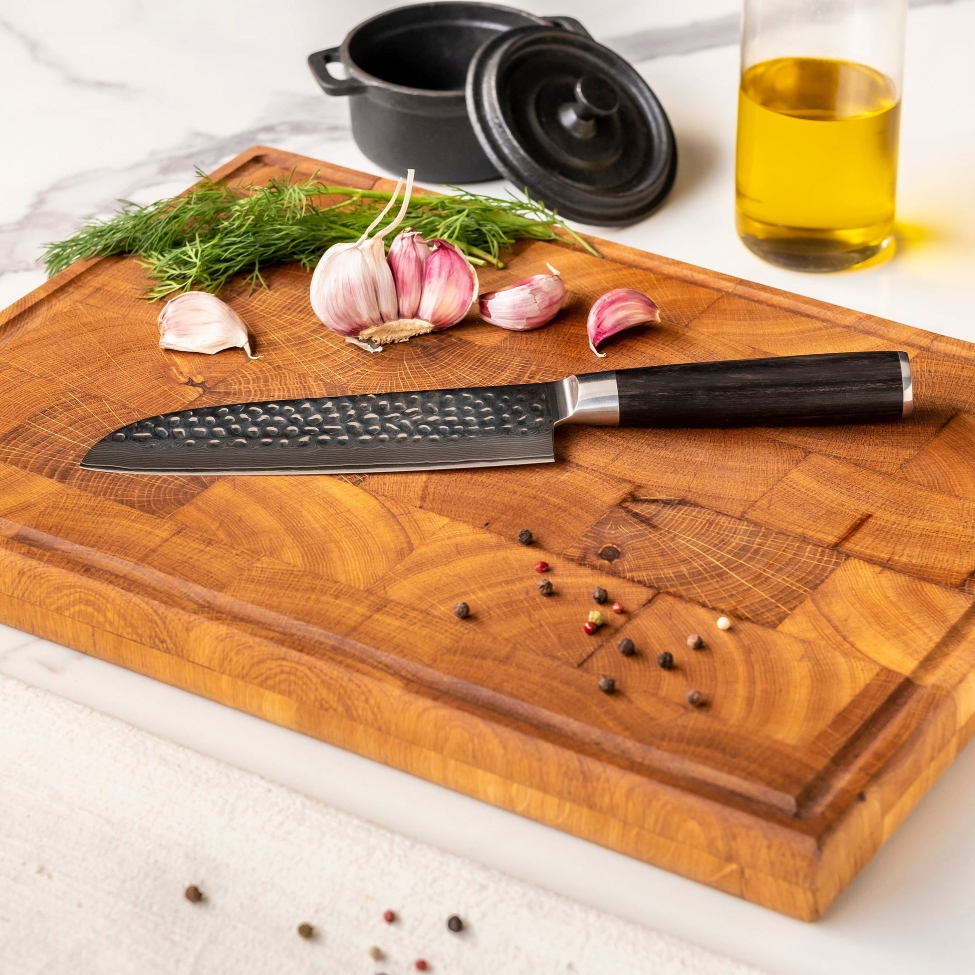 Cette édition de la série Hammered Damask BR a été finie avec précision. La lame en acier damassé martelée à la main se prolonge dans un magnifique manche en bois de pakka. La lame est martelée à la main à la japonaise. Cette technique s'appelle tsuchime. Cela garantit non seulement un tranchant élevé et une belle apparence, mais empêche également vos produits coupés de coller à la lame.