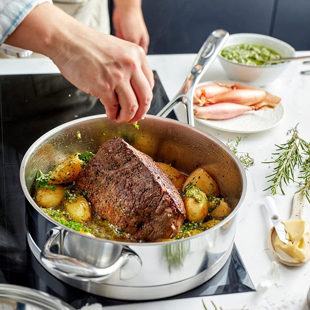 The low Atlantis 7 Low Sauteuse 28 cm from Demeyere , also called a snack pan. This pan is ideal for evenly searing meat, poultry, vegetables and seafood, and ensures that your dish continues to cook perfectly as soon as you add liquid and put the lid on.