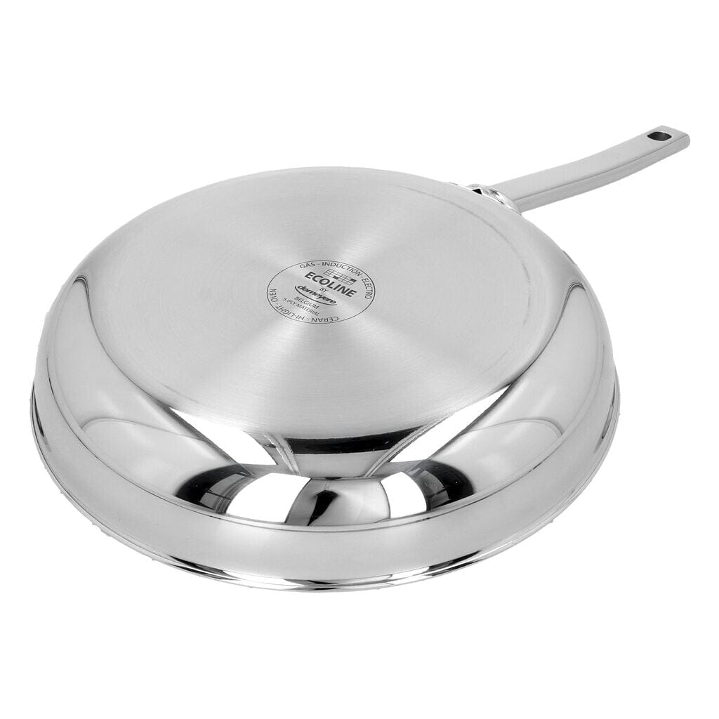 The handsome stainless steel Ecoline 5 frying pan (28 cm) from Demeyere is a joy to work with and delivers beautiful results. It fits comfortably in your hand and is constructed from 5-layer material, right up to the rim. This solid combination of alloys distributes heat effectively, allowing you to fry evenly and with control, even on a low setting.