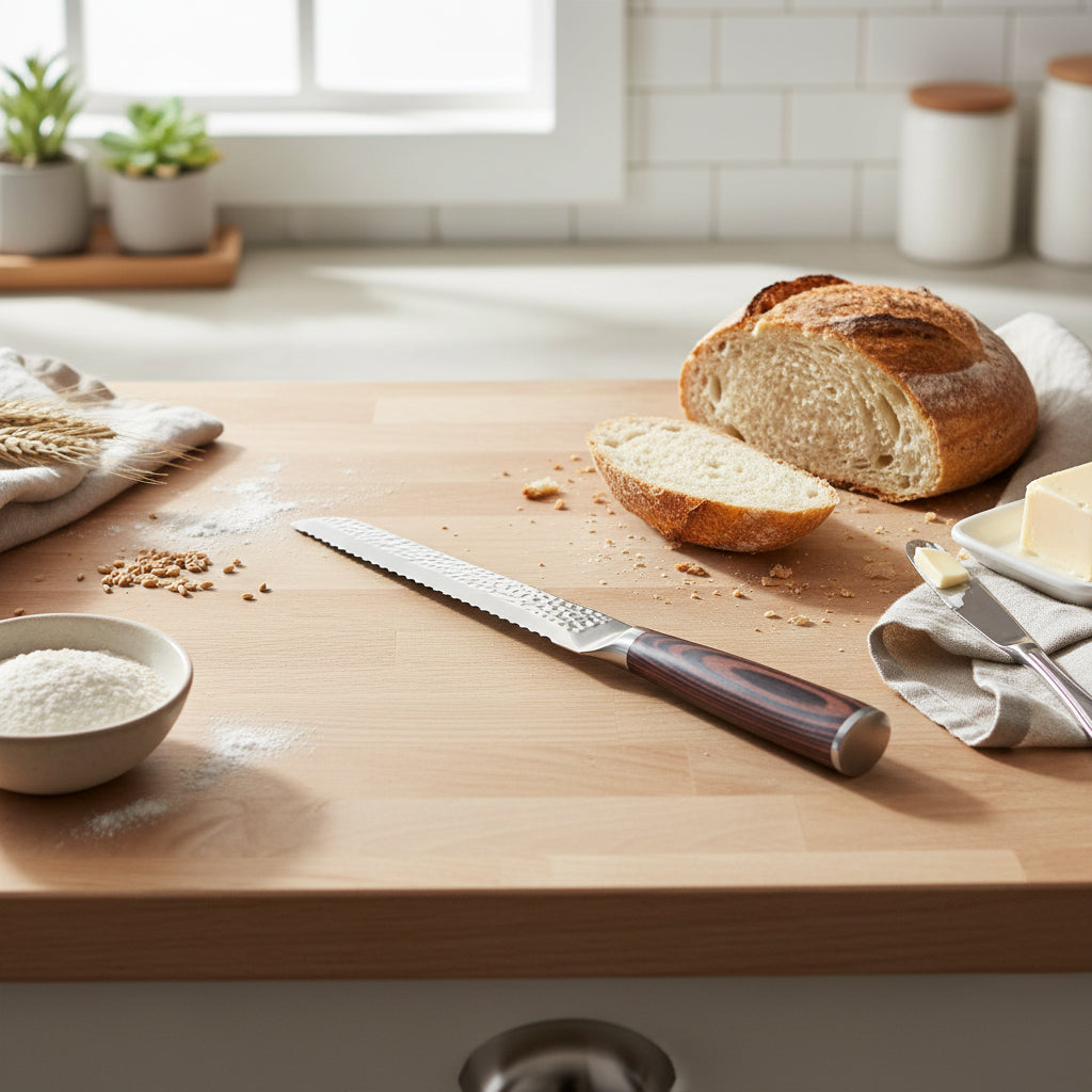 Experience the comfort of a sharp bread knife with a perfect grip. Order your Hammered Stainless Steel Bread Knife today and bring functionality and design together in your kitchen.